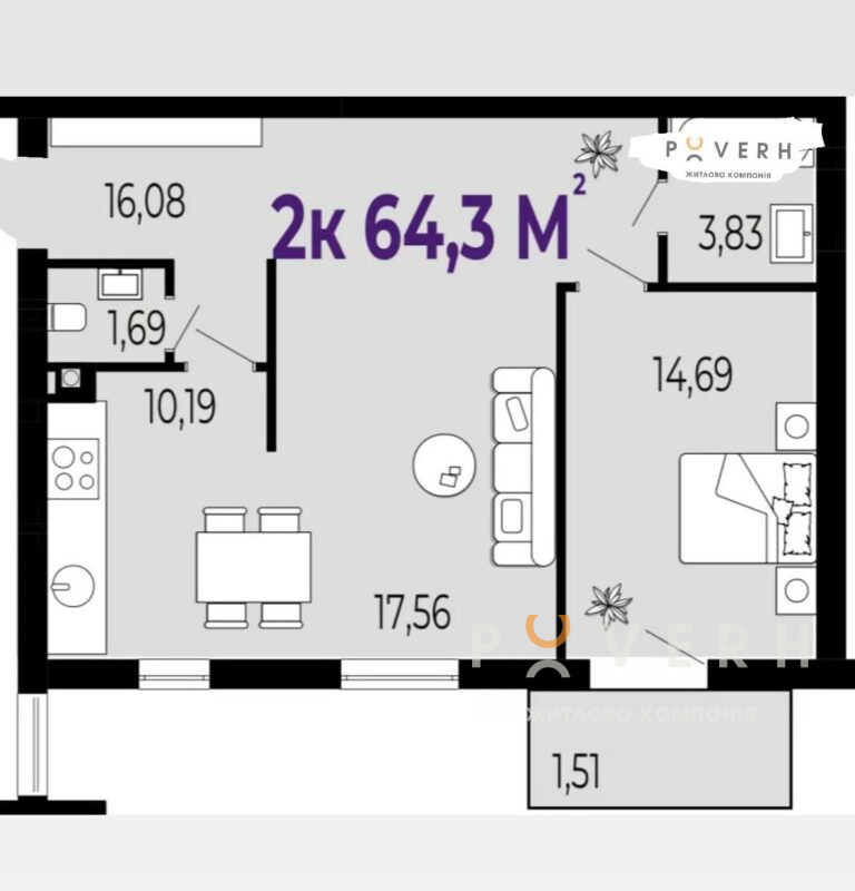 Площа: 64.3 м2