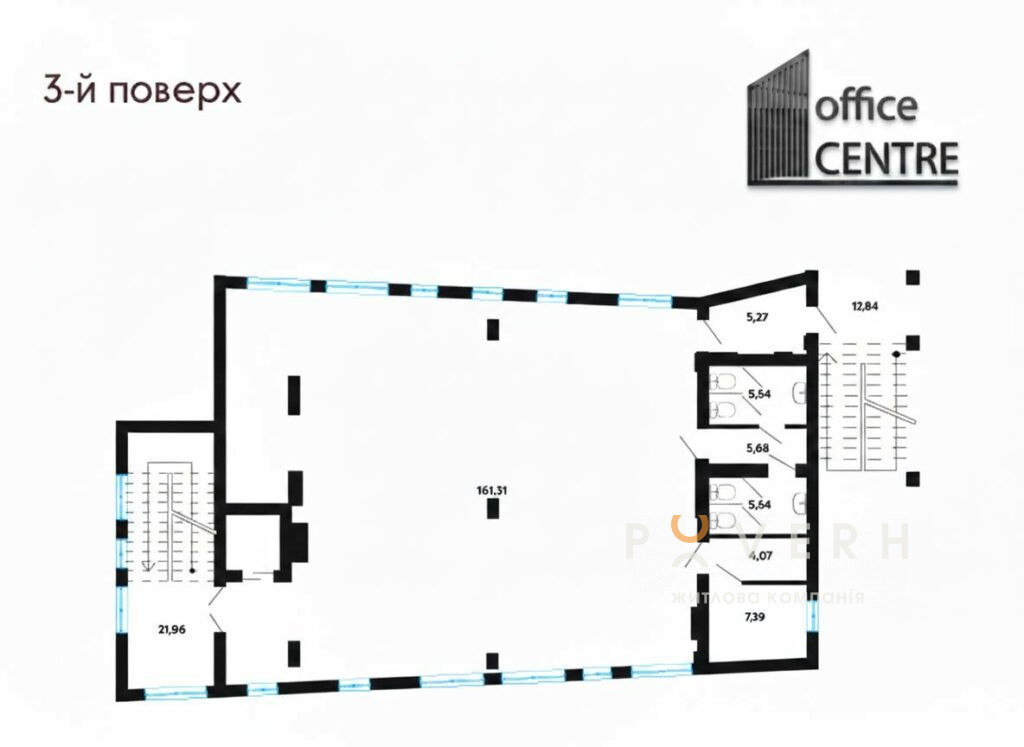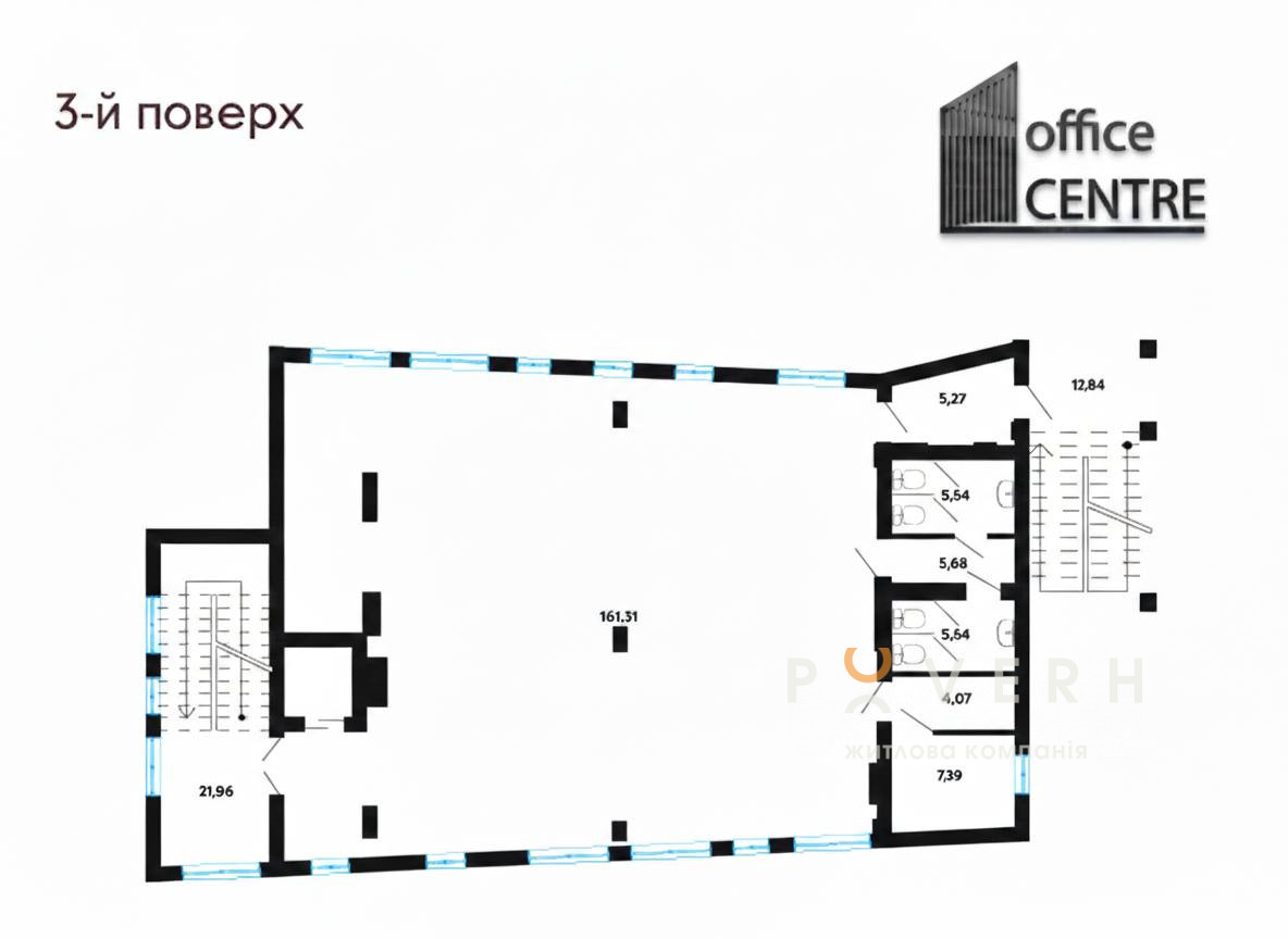 – 2 виходи (центральний і пожежний з відкритою сходовою)