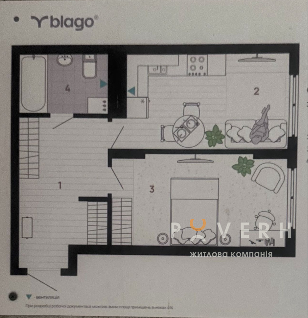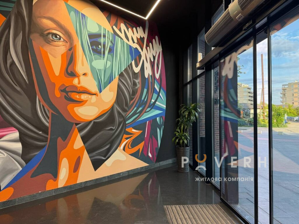 Велика кухя з панорамним вікном, простора спальня, сумісний санвузол та вхідна група з нішею під шафу -купе.