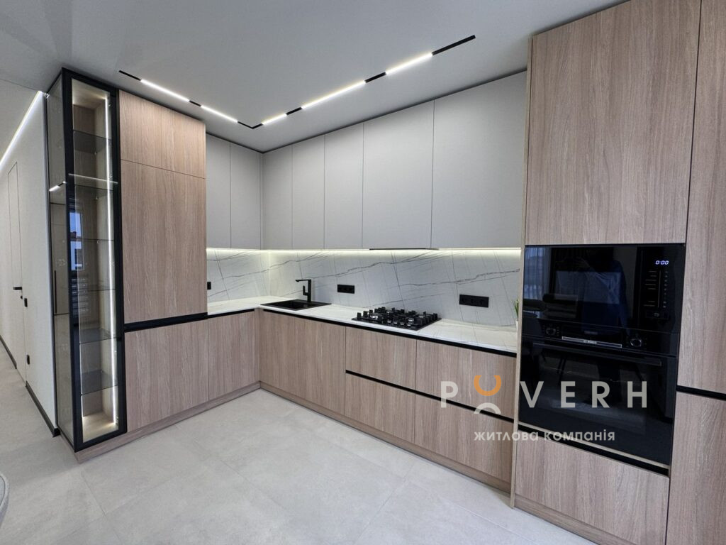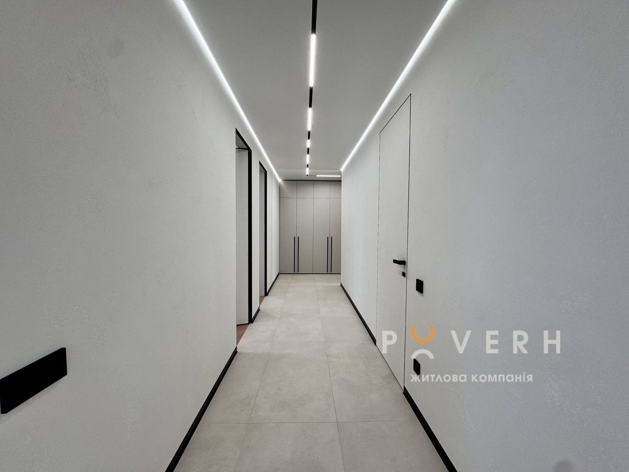 У квартирі двері прихованого монтажу , сучасне освітлення та трекові світильники створюють атмосферу затишку та стилю.