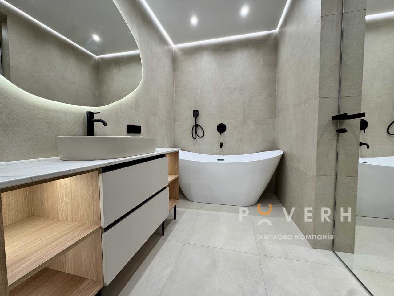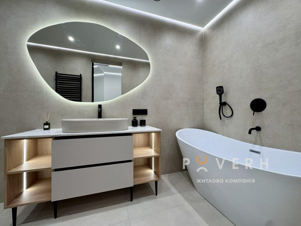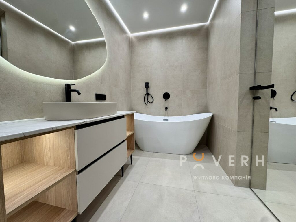 – Просторий санвузол із великою душовою кабіною, окремостоячою ванною, інсталяцією з гігієнічним душем та рукомийником із дзеркалом і підсвіткою.