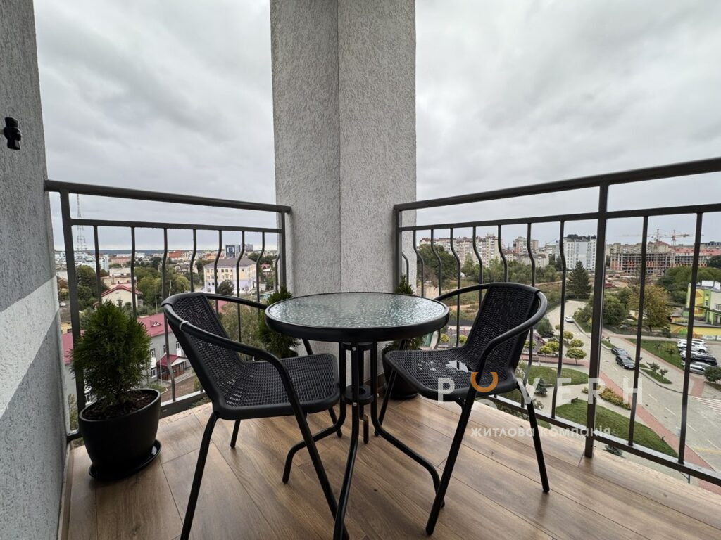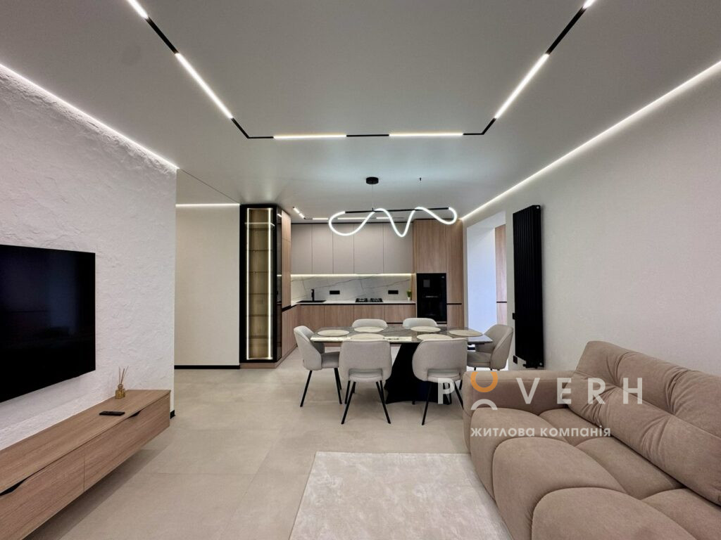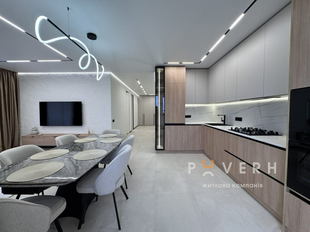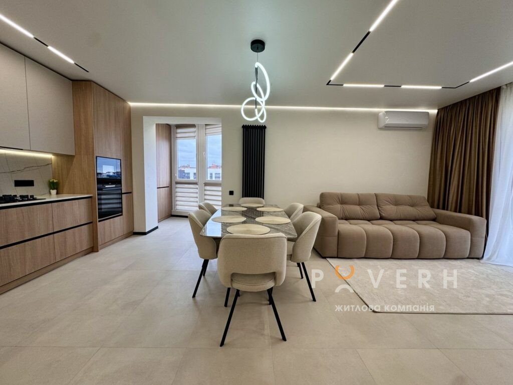 – Велика кухня-вітальня укомплектована сучасною технікою: духовка, мікрохвильова піч, газова поверхня Bosch, вмонтована посудомийна машина «60-ка» та холодильник Whirlpool та зона відпочинку з великим розкладним диваном, телевізором Samsung 65, кондиціонером та обіднім столом на 6 персон. Є вихід на великий відкритий балкон із облаштованою зоною відпочинку та видом на місто.