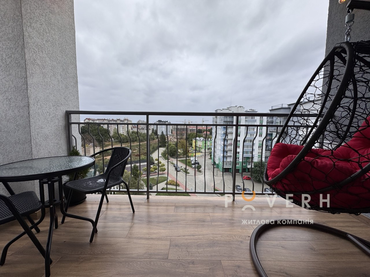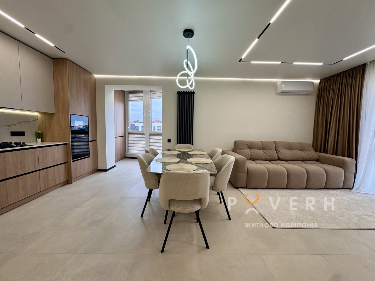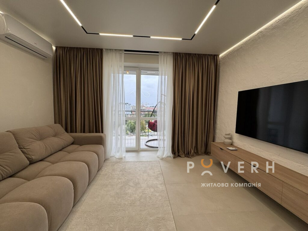 – Велика кухня-вітальня укомплектована сучасною технікою: духовка, мікрохвильова піч, газова поверхня Bosch, вмонтована посудомийна машина «60-ка» та холодильник Whirlpool та зона відпочинку з великим розкладним диваном, телевізором Samsung 65, кондиціонером та обіднім столом на 6 персон. Є вихід на великий відкритий балкон із облаштованою зоною відпочинку та видом на місто.