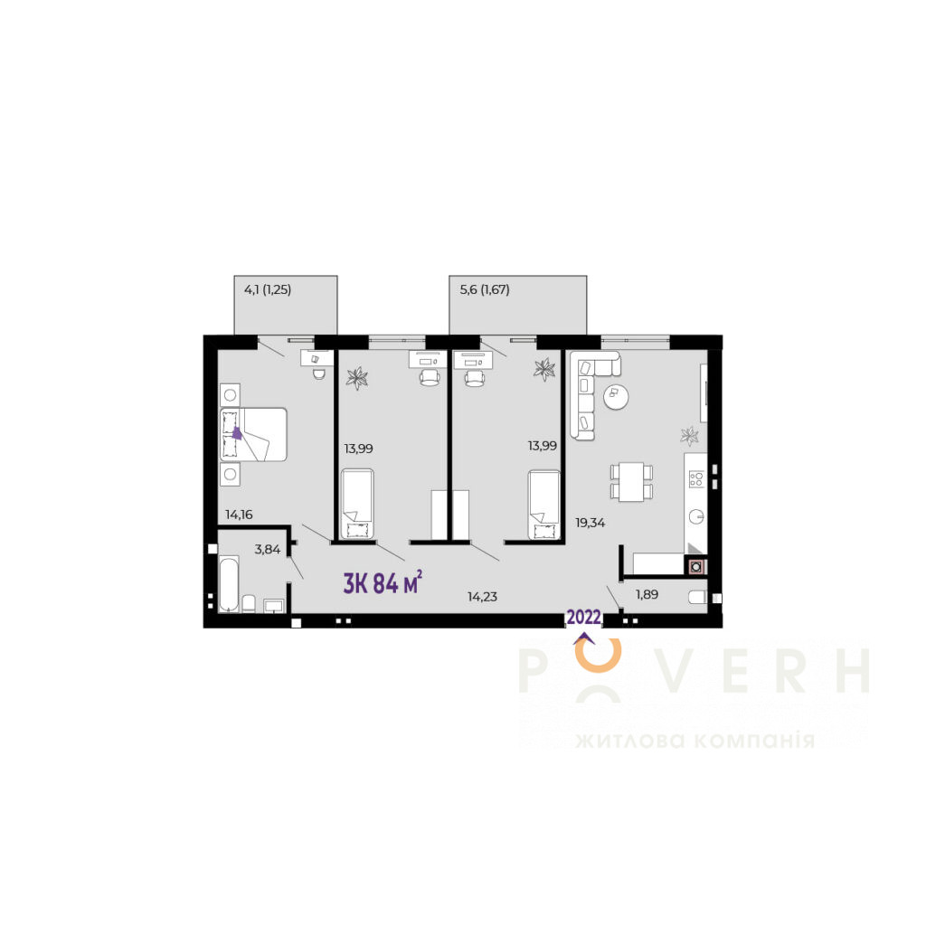 Секція 20, 2 поверх, 3 кімнатна квартира 84 м2 з двома відкритими балконами.