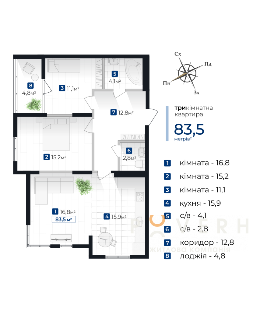 3-кімнатна квартира, площа 83,5 м².