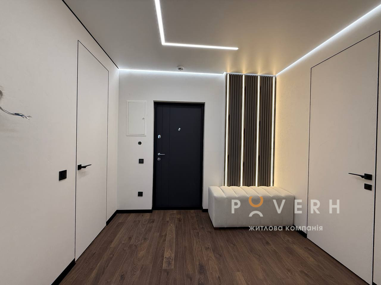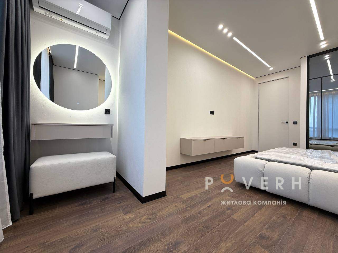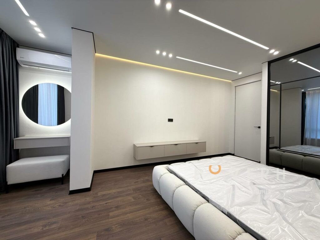 Інтер’єр виконаний у сучасному стилі з використанням якісних матеріалів: